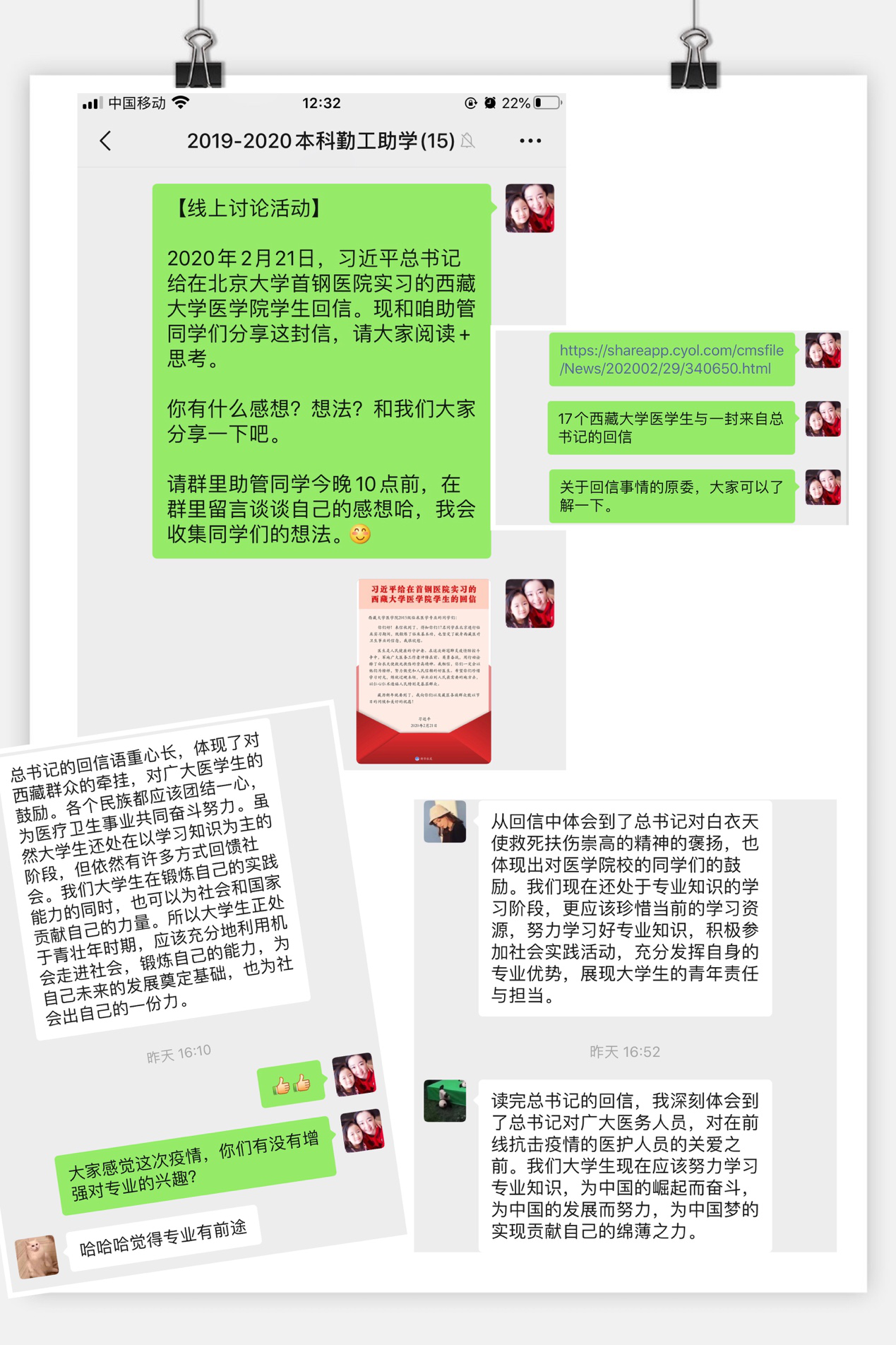学办思政辅导员将信件内容及事件原委报道发送至各年级班委群中,组织各班进行阅读学习。同时,思政辅导员在微信群中与公司勤工助学员工一起进行了线上讨论和分享。