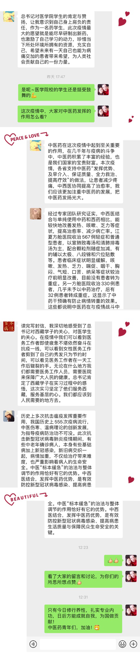 从同学们的回信读后感和讨论中可以看到,一,习主席信中褒扬了新冠疫情防控斗争中的医生们,这次疫情同学们也被医护人员的敬业奉献、救死扶伤的崇高精神感动;二,习主席的鼓舞,疫期间中医药发挥的作用,也让同学们对自己所学的专业更加热爱和坚定;三,回信中,习主席提出殷切希望,让医员工们练就硬本领,毕业后到人民最需要的地方去。同学们看后也热血沸腾,有的同学表态,要学习好专业知识,练就过硬本领,毕业后要回家乡、去基层,让青春在祖国、人民最需要的地方闪光。