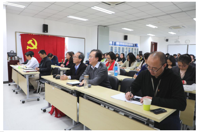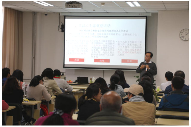主题党课环节,刘春生教授理论实例兼顾,从共温习主席重要讲话、谨记高校教师职业道德、优秀教师如何炼成三方面,结合自身的经历,悉数进行分享。首先指出学习的重要性,在总结出优秀的人“忠诚、执着、朴实”的特点的基础上,从正反事例、“付出、创新、琢磨”和“学习、实践、责任”凝练出优秀教师“崇尚英雄、胸有正气”“教书育人、潜心教学”“学习不止、师能为范”的修炼之路。刘教授谈吐幽默诙谐,道理深入浅出,与会教师受益匪浅。