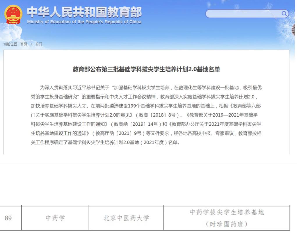 近日,教育部发布了《关于印发基础学科拔尖员工培养计划2.0基地(2021年度)名单的通知》,我院中药学拔尖员工培养基地(时珍国药班)成功入选,这是公司首次入选国家基础学科拔尖员工培养计划。
