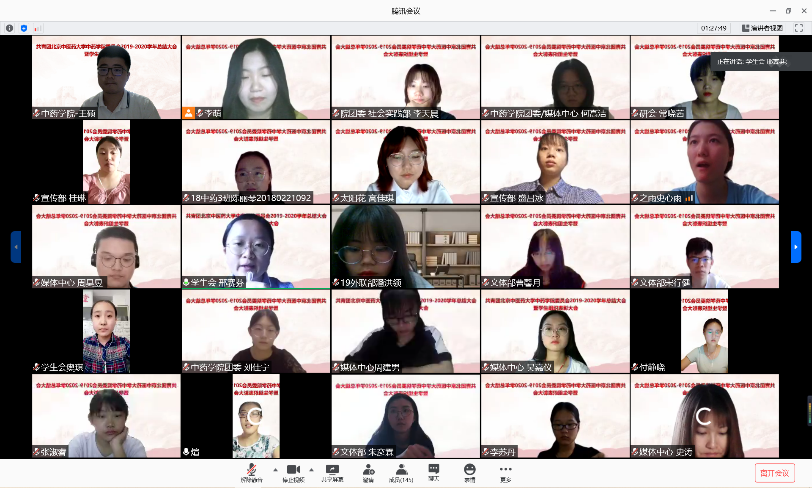 会议伊始,全体成员起立,奏唱《中国共产主义青年团团歌》。随后团委副书记李萌,员工会主席团张宇煊、奥琪、付静晓、邢赛芬,研究生会主席常晓茜,员工媒体中心主任周昊昱、史涛,之雨志愿者协会会长史心雨,太阳花志愿者协会会长高佳琪分别对所在组织一年的工作情况进行汇报发言。王硕老师就上一学年的公司共青团工作向大会做汇报,对过去一年公司全体共青团干部、员工干部的工作给予充分肯定,希望公司下一届员工干部可以继往开来,砥砺前行,更好组织完成共青团员工工作。