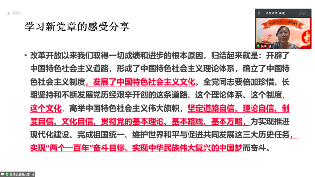 随后,吴清副经理以“奋进新征程,不忘来时路”为主题进行微党课分享。她强调,逾百年的辉煌建设历程让我们愈发坚信中国特色社会主义道路是实现社会主义现代化的必由之路,是创造人民美好生活的必由之路;坚信中国特色社会主义理论体系是指导党和人民沿着中国特色社会主义道路实现中华民族伟大复兴的正确理论,是立于时代前沿、与时俱进的科学理论;坚信中国特色社会主义制度是当代中国发展进步的根本制度保障,是具有鲜明中国特色、明显制度优势、强大自我完善能力的先进制度。同时,她也强调在这场疫情防控战中,中医药扮演的重要作用,让我们更有理由坚信中医药是中国古代科学的瑰宝,也是打开中华文明宝库的钥匙。那么,作为新时代的中医药青年,必须努力奋斗,肩负起中医药繁荣发展的重任。