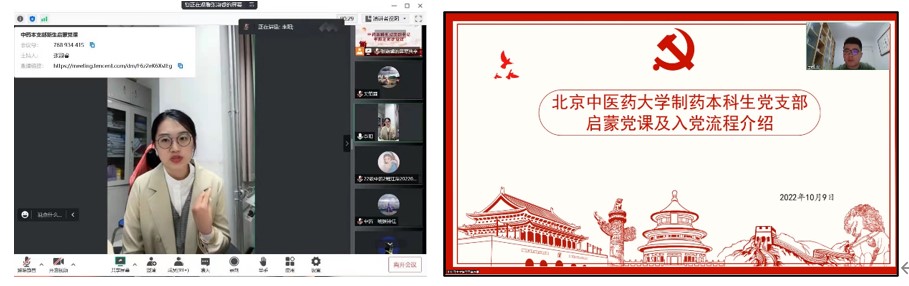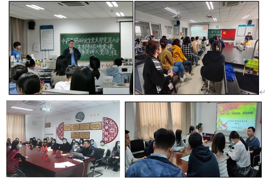 “书记讲党课”环节,各员工党支部书记将政治教育与专业教育相结合,开展了多主题的党课分享。中药制药研究生党支部书记吴凯同志开展以“重温红色革命史,蓄力迎接二十大”为主题的党课教育,带领大家重温党史,并强调新时代共产党人应不忘初心、勇于担当。中药药理研究生党支部书记张超同志为大家介绍了中国共产党的光辉历史,并分析了不同的入党态度,强烈呼吁大家一定要树立正确的入党动机,履行正确的入党程序。药物分析研究生党支部书记马鹏凯同志开展了“启蒙党课培训——领悟党史,牢记初心”活动,鼓励大家从党史学习中汲取经验与智慧,勇于面对生活中的挫折。中药信息学研究生党支部书记徐冰同志以“喜迎二十大:矢志创新、报效祖国”为主题,从国家政策入手,向同志们发出了“要终身学习,并且要融入到团队、国家发挥更大的能力与作用”的号召。中药化学研究生第一党支部书记张薇同志细致讲授了“从‘红船精神’到‘伟大建党精神’再到新时代研究生的‘科学精神’”,鼓舞党员同志们在科研学习生活中披荆斩棘、勇往直前。中药化学研究生第二党支部书记郑娇同志围绕“党史、国史、校史”阐释了青年员工与党和国家的关系,强调要不断加强四个意识。临床中药研究生党支部书记张晓朦同志带领大家回顾了党的百年奋斗历史,鼓舞研究生们要坚持把马克思主义基本原理同中国具体实际相结合、同中华优秀传统文化相结合,不断进步。中药生药研究生党支部书记张子龙同志开展了以“回望来时路,奋进新征程”为主题的党课分享,分析了在党的领导下中医药发展的重要性,要求新生和党员同志们要往更高处努力。中药本科生党支部书记李阳同志和大家分享了“学好专业知识,加强自我探索,提升各方面能力”这三件在大学要做的事情,鼓励大家要积极学习党的历史和重要讲话精神。制药本科生党支部书记王硕同志从“为什么要加入中国共产党”“党员的标准是什么”两方面进行论述,鼓励新生同学们从现在起就以党员标准严格要求自己。
