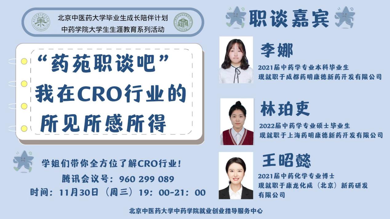 来源:yl23455永利集团 作者: 发布时间:2022-11-302022年11月30日,由yl23455永利集团主办,yl23455永利集团就业创业指导服务中心承办的“我在CRO行业的所见所感所得”职谈活动,在yl23455永利集团王硕老师的主持下,通过腾讯会议的形式成功举办。出席本次活动的职谈嘉宾有北中医2021届中药学专业本科毕业生李娜、2022届中药学专业硕士毕业生林珀吏和2021届中药化学专业博士王昭懿。同时,参会同学共计70余名。