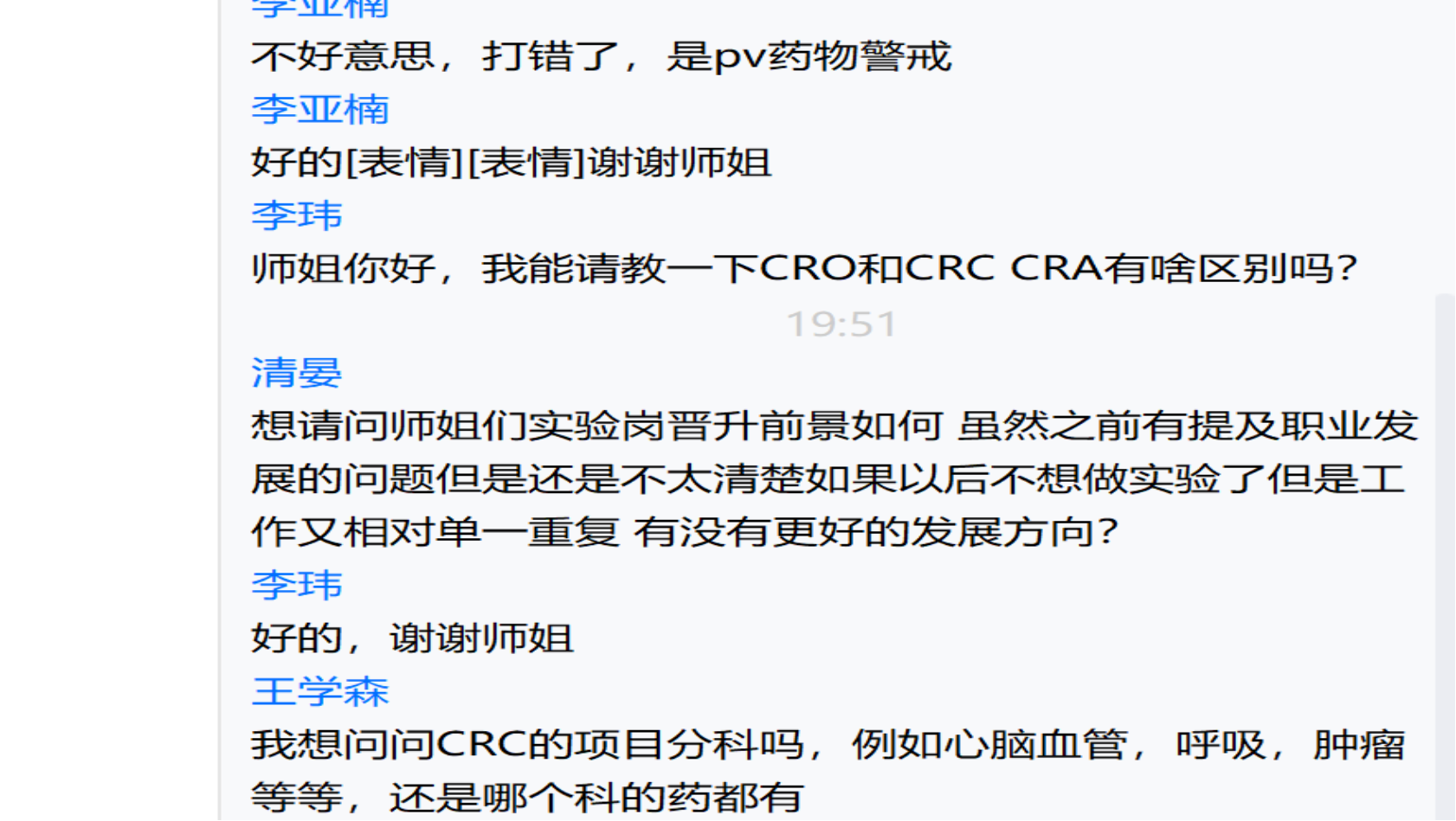 随后,活动进入提问环节,大家踊跃提出了想要了解的问题,王硕老师也代表大家询问了大家感兴趣的CRO行业的薪资、待遇和工作氛围等问题,得到了师姐们的细致解答,同时师姐们对想从事该行业的同学,给出了自己的建议。