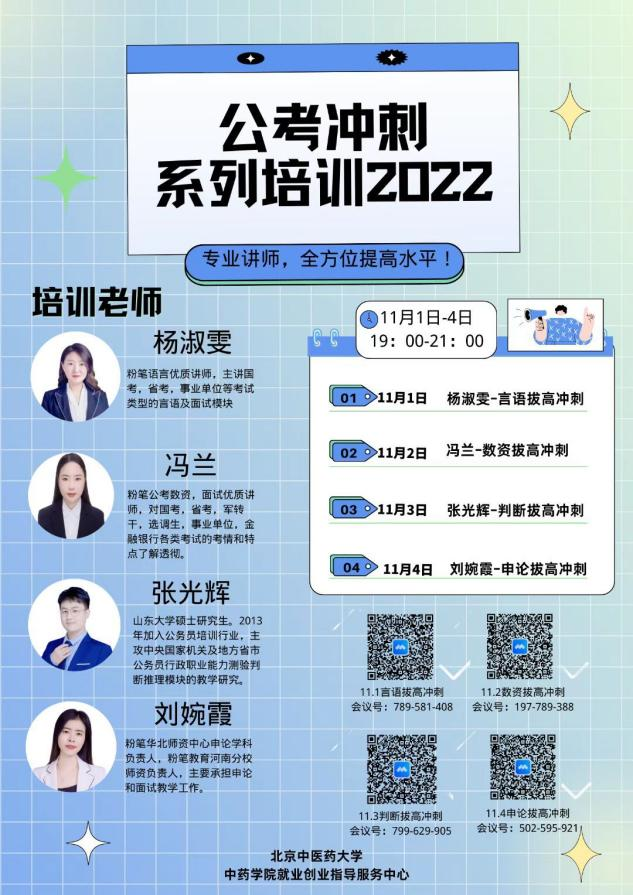 2022年11月1日至4日,由yl23455永利集团主办,yl23455永利集团就业创业指导服务中心承办的“逐梦公考,助力上岸”系列培训活动以腾讯会议的形式顺利举办。200多人次毕业生参与本次学习活动。