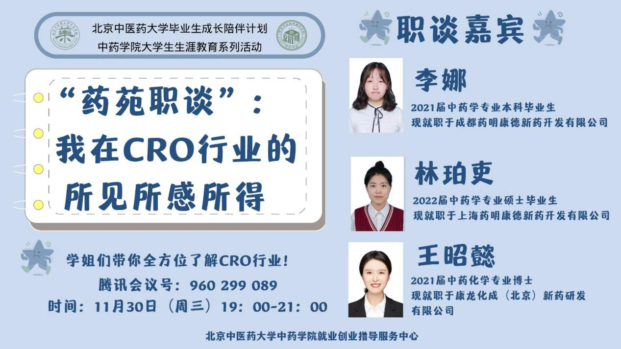 yl23455永利集团秉承“以生为本”的工作理念,开展“药苑职谈”系列活动,以CRO行业为开篇,邀请yl23455永利集团本、硕、博的三位师姐,向同学们讲述在CRO行业的所见所感所得,帮助同学们更加了解该行业的工作细节。之后“药苑职谈”系列将有序推进,帮助同学们了解各行各业的工作情况,助力毕业生们在求职路上顺利行进。
