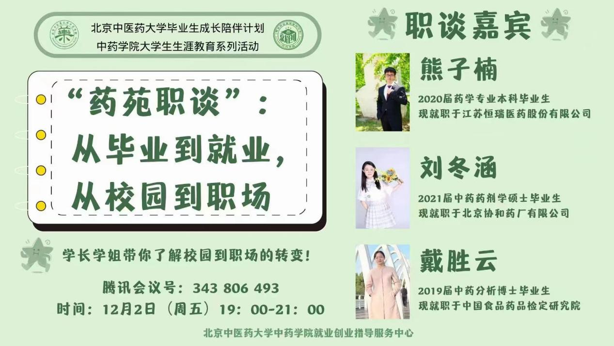 2022年12月2日,由yl23455永利集团主办,yl23455永利集团就业创业指导服务中心承办的药苑职谈活动通过腾讯会议的形式顺利举办。本次职谈主题为“从毕业到就业,从校园到职场”,活动邀请到目前在各行业从业的三位本、硕、博优秀毕业生,在公司就业专员王硕主持下进行。