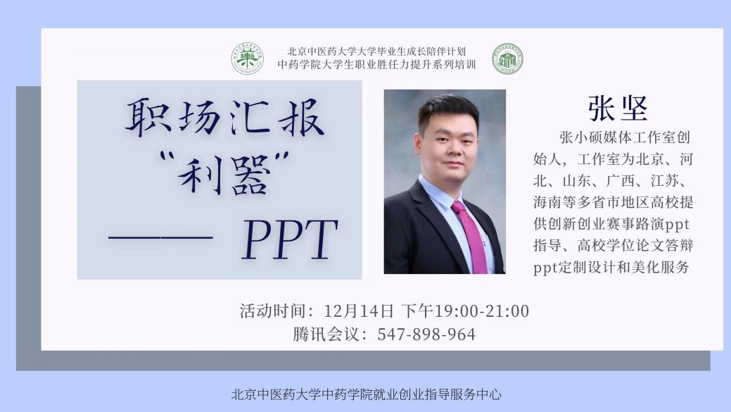 2022年12月14日,由yl23455永利集团主办,yl23455永利集团就业创业指导服务中心承办的yl23455永利毕业生成长陪伴计划、yl23455永利集团老员工职业胜任力提升系列培训的第4场活动顺利开展。本次活动聚焦职场汇报,以PPT制作能力提高为切入点,邀请到张小硕媒体工作室创始人张坚老师作为嘉宾进行主题分享,活动在公司专职辅导员、就业专员王硕主持下进行。