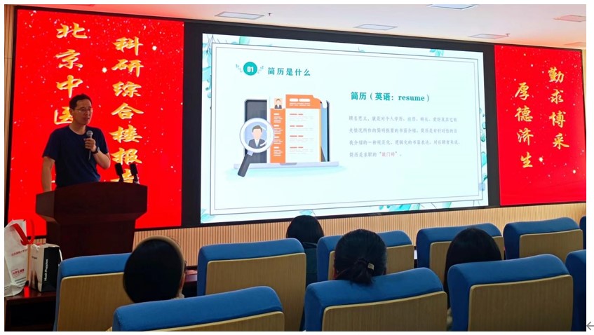 活动伊始,生命科学公司就业专员王利老师作为特邀嘉宾为同学们分享简历及面试能力提升培训。他首先指出,职场如战争,没有经验是一成不变的,建议同学及时总结自己的个性化经验,争取更好地应对残酷的求职季;同时,他还提醒同学们务必保持“招聘者”视角,以招聘者的思维去应对招聘才能更加有的放矢;最后他也建议同学们务必珍惜“熟人关系”,积极利用自身的人际关系获得内推的机会,才能获取更多的成功机会。