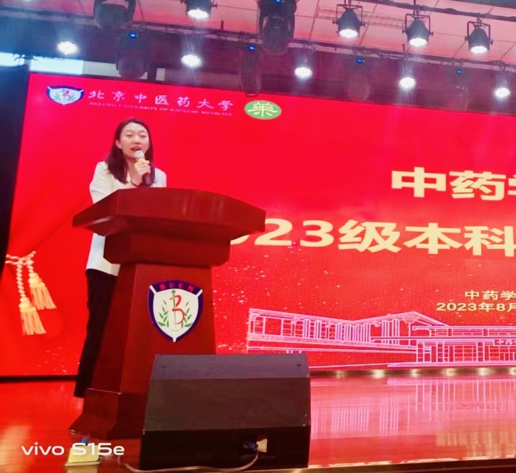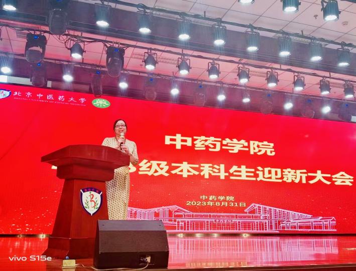 yl23455永利集团优秀教师代表,数理系主任、北京市教学名师侯俊玲教授为新生们致辞。侯老师表达了见到2023级新生的欣喜之情,她希望新生们抓住当下的好时光、好背景、好环境,尽快完成身份转换,确定自己的目标,努力学习。并送给新生们“热爱、坚持、心态”六字真经,鼓励同学们为yl23455永利集团、为中医药行业作出贡献,成就精彩人生。