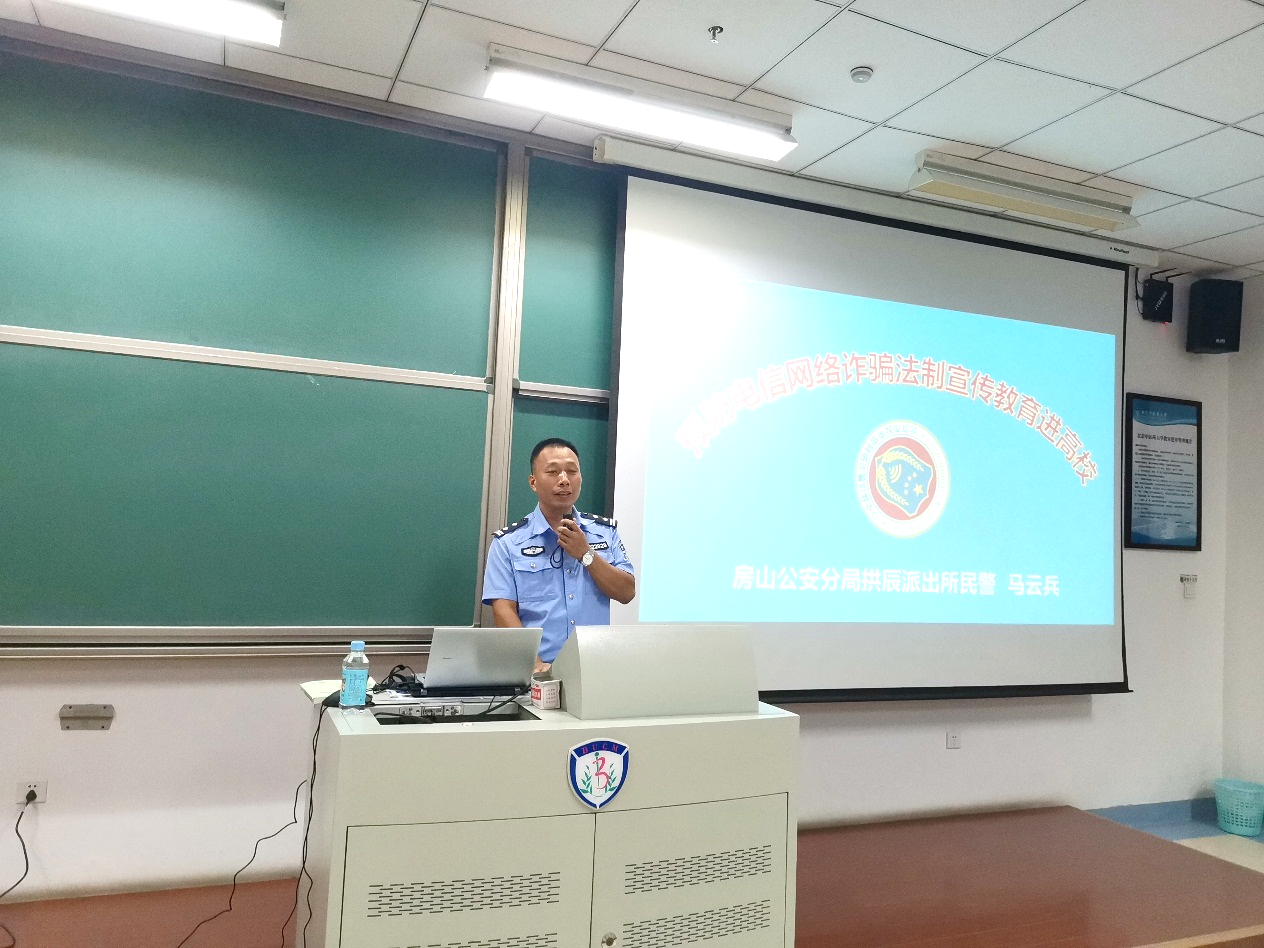 马云兵警官围绕“预防电信网络诈骗”这一主题进行了分享。他从网络诈骗的起源入手,提出了“诈骗四步法”,分别是:与你接触、建立信任、设计圈套、要你的钱。他深入阐释了交友投资、网络贷款、刷单兼职、交易异常这四类网络诈骗的特征,并向同学们提出了如下希望:一是下载并注册安民反诈APP,自主进行安全教育;二是了解96110反诈专用电话的内涵;三是牢记拱辰街道派出所电话69352114。