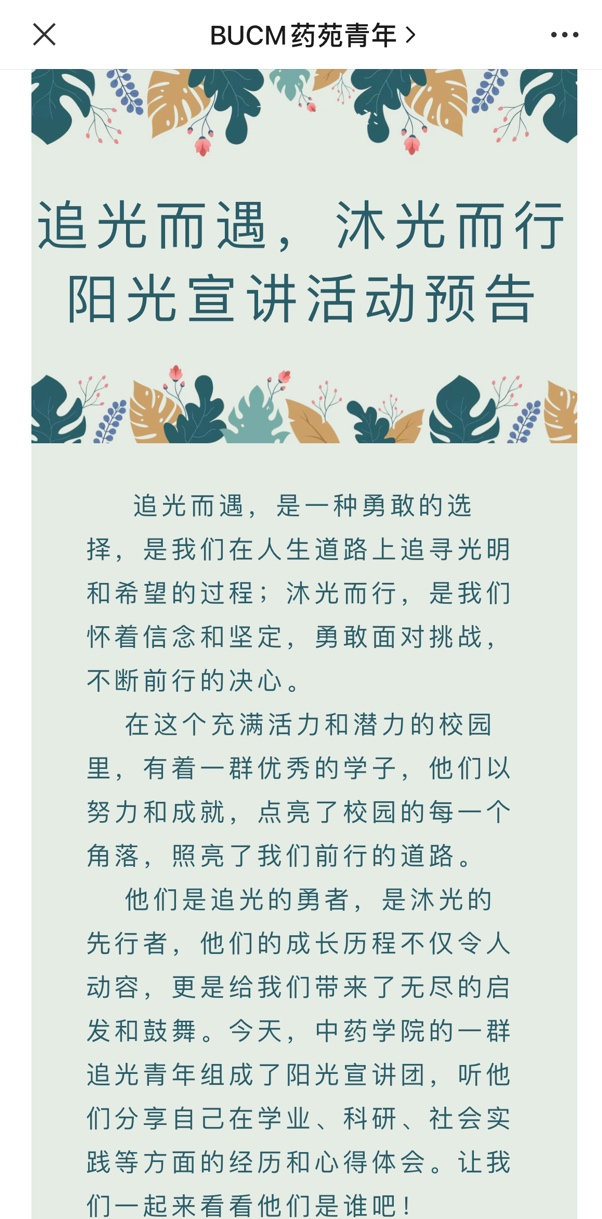 本次宣讲分为活动宣传、活动现场、活动总结三个部分。宣讲活动前期,公司通过公众号推送等方式为宣讲活动作出宣传,使活动最大范围辐射到员工,使有意义的活动惠及更多同学。