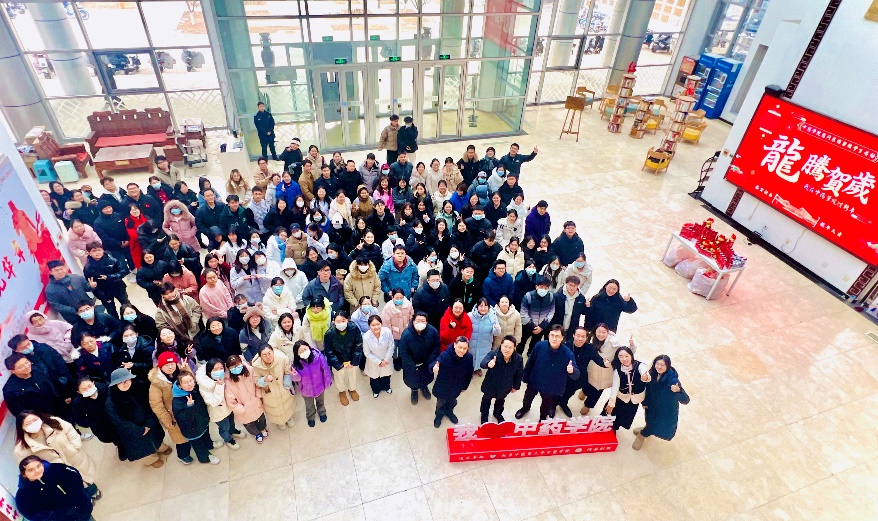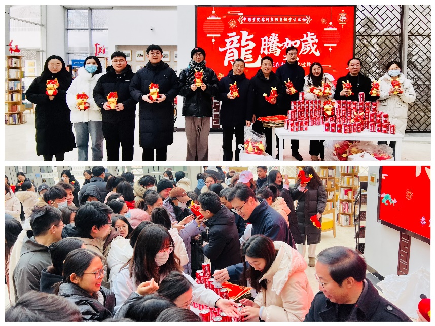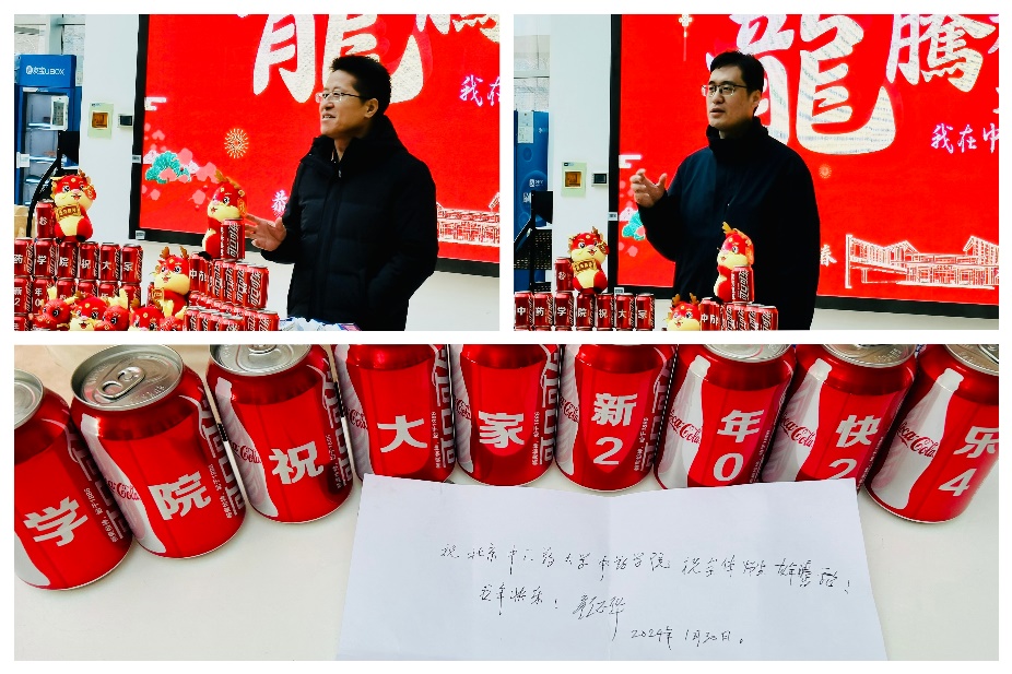 公司领导依次向留校员工分发春联、福字、窗花、定制可乐、龙年玩偶、牛奶等新春慰问品。现场气氛热烈,其乐融融,全体师生共同发出“新年快乐”的祝愿,祝福大家龙行龘龘、前程朤朤。