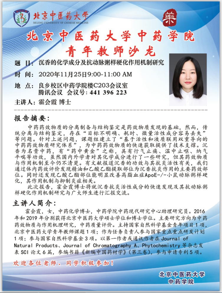 【yl23455永利集团青年教师沙龙】霍会霞:沉香的化学成分及抗动脉粥样硬化作用机制研究