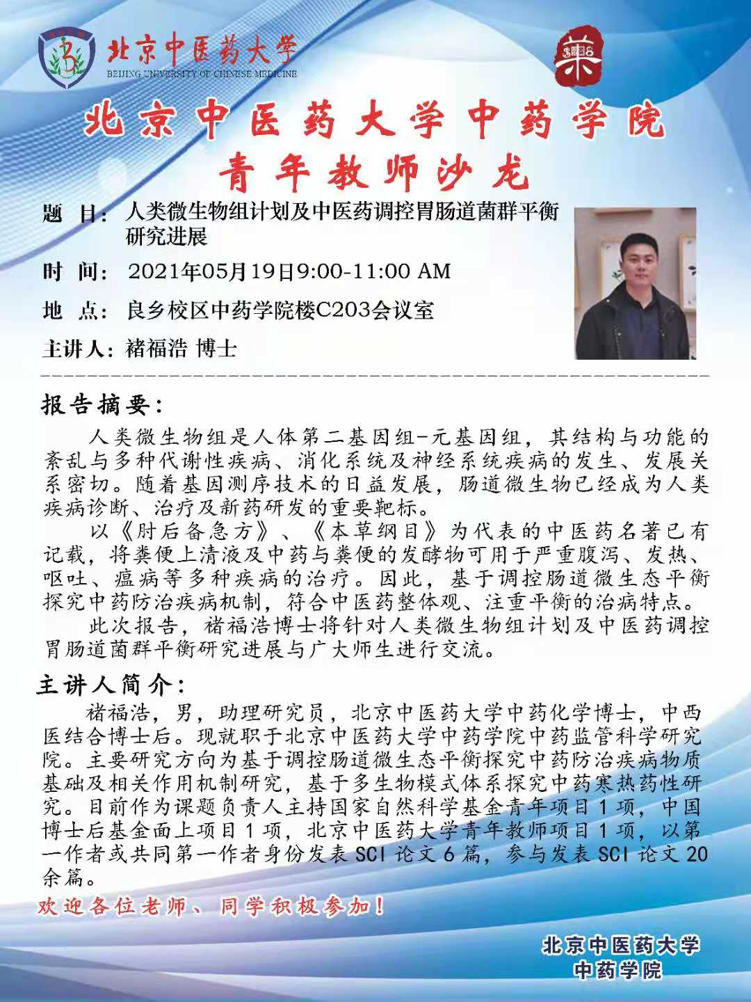 【yl23455永利集团青年教师沙龙】褚福浩:人类微生物组计划及中医药调控胃肠道菌群平衡 研究进展