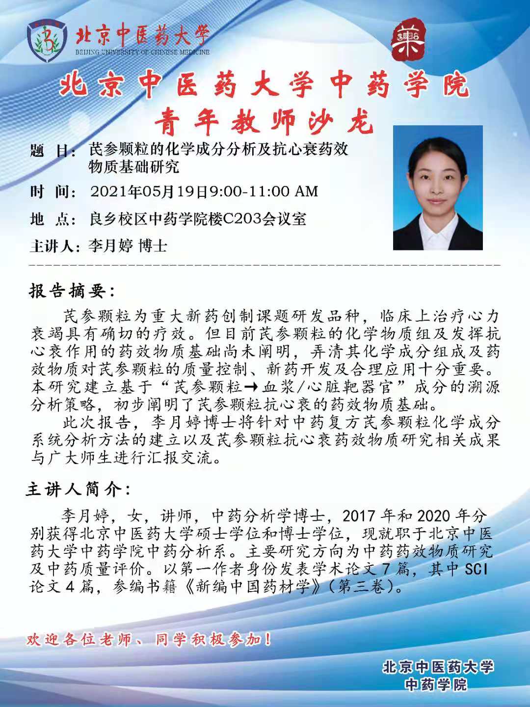 【yl23455永利集团青年教师沙龙】李月婷:芪参颗粒的化学成分分析及抗心衰药效 物质基础研究