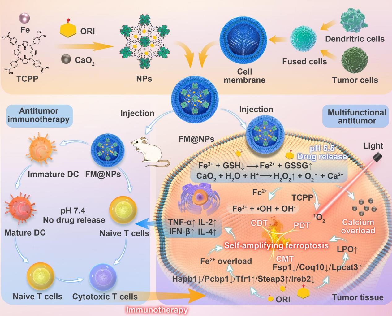 研究通过肿瘤细胞和树突状细胞融合形成的杂交细胞膜修饰纳米粒可诱导纳米粒子肿瘤主动靶向,在肿瘤微酸性和高浓度GSH环境触发下释放Fe3+和冬凌草甲素,调控Hspb1/Pcbp1/Ireb2和Fsp1/Coq10通路,促进细胞铁死亡。Fe3+诱导的化学动力治疗,TCPP诱导的光动力治疗,CaO2诱导的肿瘤微环境改善,协同致敏铁死亡。此外,本文还针对铁基纳米载体在体内的分布和清除情况展开研究,表明纳米平台在肿瘤部位显示出特异性的蓄积,金属铁离子可以在一个月内通过肾脏排出体外,未在体内造成蓄积,显示出良好的生物安全性。相关研究成果以“An Iron-Based Metal-Organic Framework Nanoplatform for Enhanced Ferroptosis and Oridonin Delivery as a Comprehensive Antitumor Strategy”为题发表在中科院一区Top期刊Acta Pharmaceutica Sinica B(https://doi.org/10.1016/j.apsb.2024.05.015)。