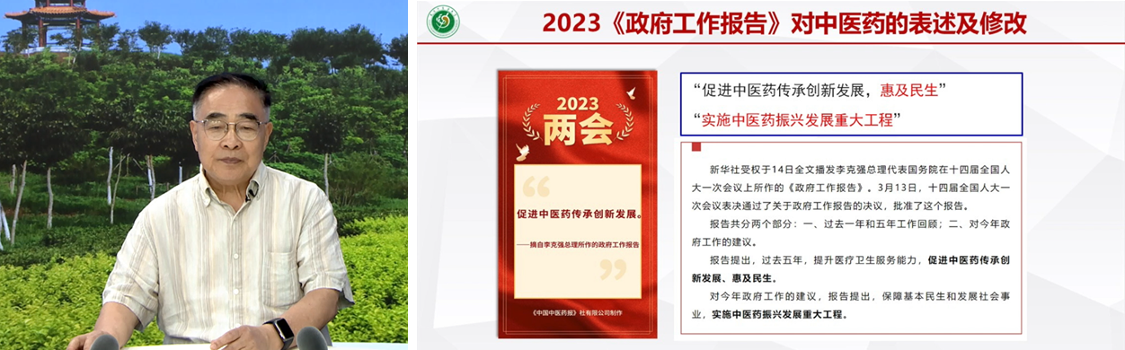 本次大会主旨报告环节特邀会议主席张伯礼院士作了题为“Thoughts on the high-quality development of TCM in the new era(《新时代中医药高质量发展的思考》)的报告,重点介绍了疫情后期世界格局变化、中医药全程介入新冠救治的优势与特色、中医药传统文化传承与创新发展现状,深度分析和分享了中医药高质量发展面临的重大问题以及解决重大问题的实践经验。