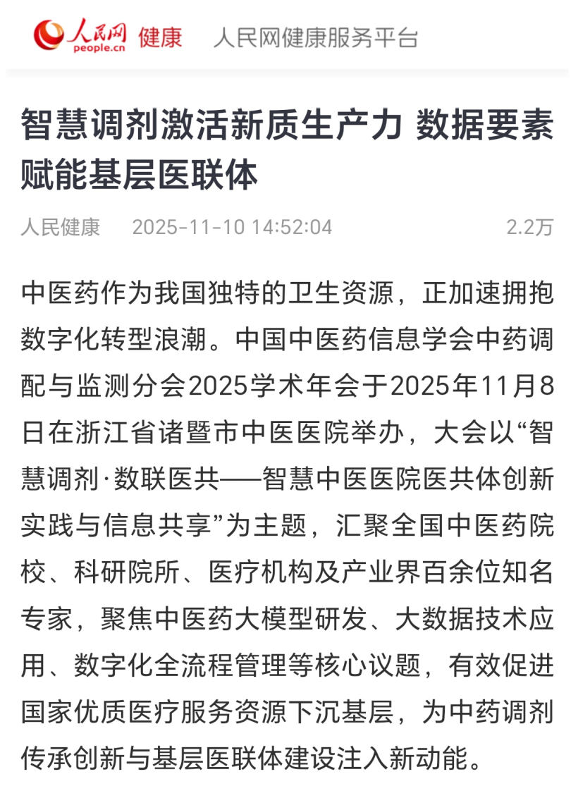来源:yl23455永利集团 作者: 发布时间:2025-11-122025年11月8日,中国中医药信息学会中药调配与监测分会2025学术年会在浙江诸暨举办。本次会议由中药调配与监测分会、yl23455永利中药调剂标准化研究中心主办,以“智慧调剂,数联医共--智慧中医医院医共体创新实践与信息共享”为主题,聚焦中医药大模型研发、大数据技术应用、数字化全流程管理等热点,有效促进国家优质医疗服务资源下沉基层,为中药调剂传承创新与基层医联体建设注入新动能。大会得到人民网关注报道。