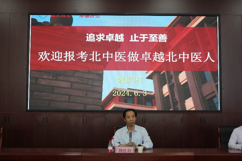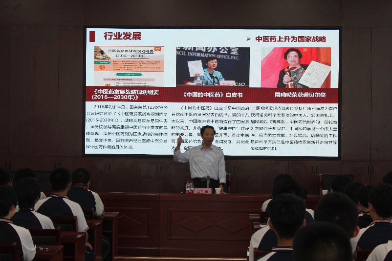 交流结束后,魏胜利副经理应邀为两所高中的200余名清北班员工代表进行了招生宣讲活动。魏胜利副经理在系统分析未来中医药大健康科研与产业前景的基础上,详细介绍了公司在历史革沿、办学理念、专业设置、人才培养、招生情况、就业方向和社会贡献等方面的现状和取得的成绩。通过优秀员工和员工的事迹举例,向同学们展现了中医药的魅力和良好的发展前景,并鼓励同学们好好学习,能圆梦北中医,致力于中医药事业的传承与发展。同学们聚精会神,对中医药专业和公司表现出强烈的兴趣。