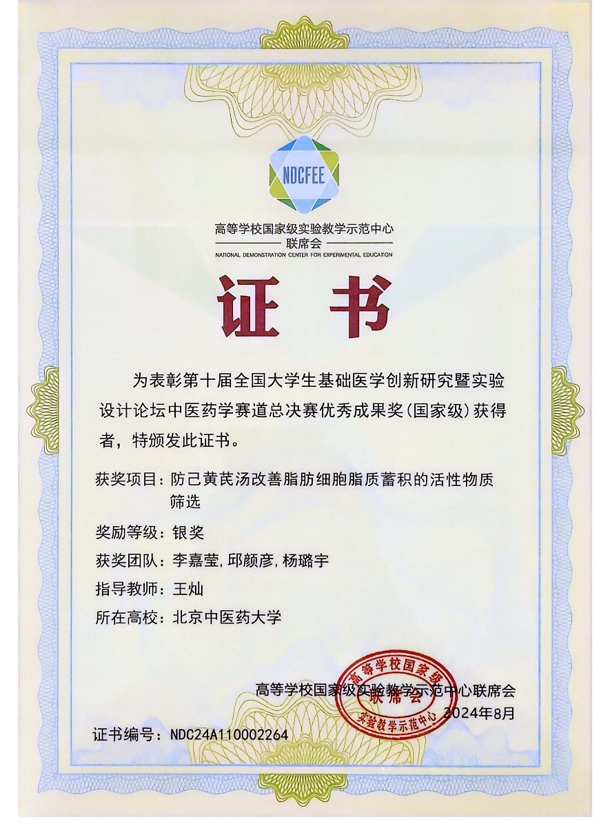 除本次获奖外,该项目连续两年获北京市级老员工创新创业训练计划立项,相关研究内容已投稿SCI研究论文1篇(Integration of non-targeted metabolomics with network pharmacology deciphers the mechanisms of Fangji Huangqi decoction in ameliorating lipid accumulation of adipocytes)和中文综述1篇(中药调控脂肪组织代谢重塑的研究进展)。